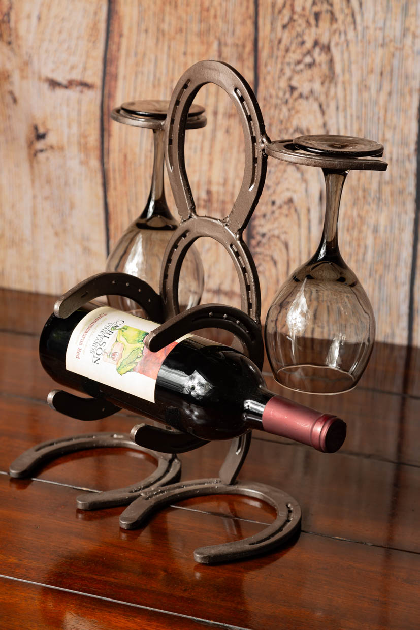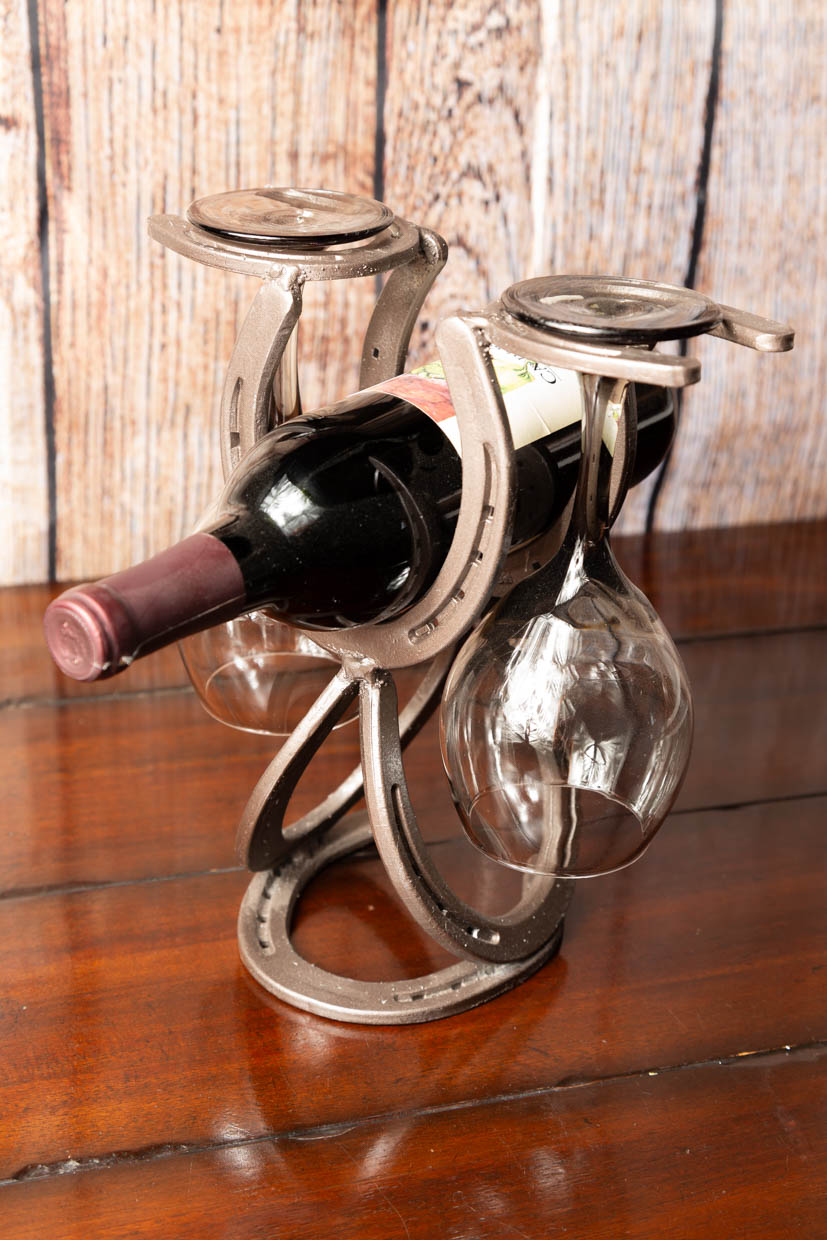 Horseshoe Wine Holder – Small: Designed and handmade from durable horseshoes, this holder is crafted to securely display 2 wine bottles and glasses, making it an eye-catching addition to your home or entertaining space. Perfect to hold your toasting glasses for your Western wedding and a great addition to your farmhouse, ranch, or Western-inspired decor. Offers a unique way to showcase your favorite wines and stemware in style! (Wine and glasses not included).