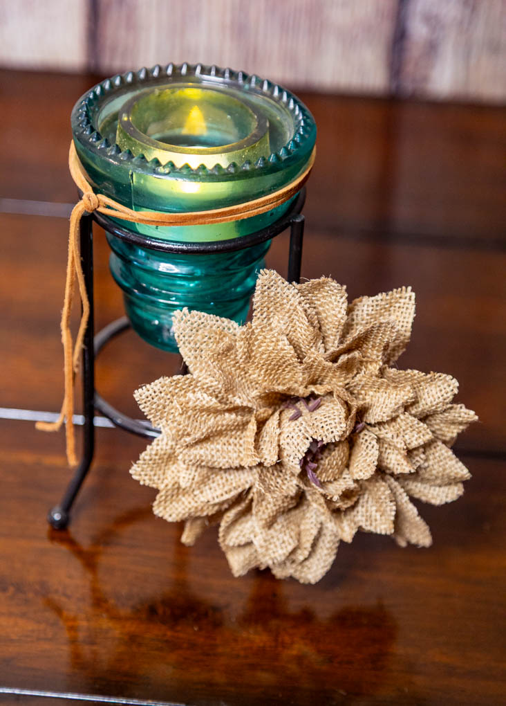 Vintage Insulator Candle Holder – Beige Burlap Flower