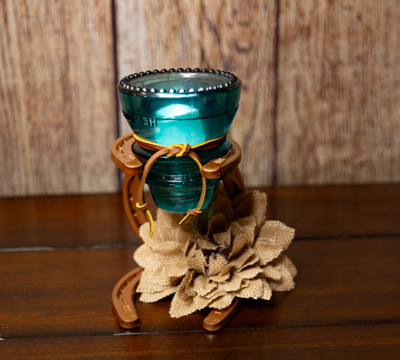 Vintage Insulator Candle Holder – Beige Burlap Flower – Add a charming touch of rustic elegance to your event with this vintage insulator candle holder. Perfect for your Western or rustic wedding or as part of your log home, ranch or farm house. Features a vintage turquoise-colored glass insulator, metal stand, and adorned with a…